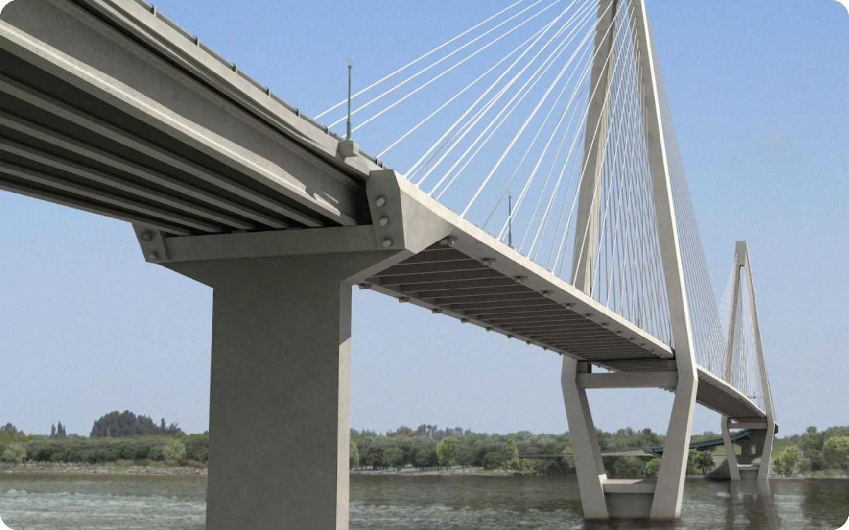 El proyecto contempló el diseño geométrico de una autovía de alta prestación, con doble calzada, banquinas pavimentadas y separador central, adaptada a las condiciones de llanura y a velocidades directrices elevadas. En paralelo, se desarrolló el diseño estructural de puentes y viaductos, incluyendo el puente principal atirantado sobre el canal de navegación, con gálibos horizontales y verticales que aseguran la compatibilidad con la navegación fluvial actual y futura. Estas definiciones integraron criterios viales, estructurales y de navegación en una solución única y coherente.